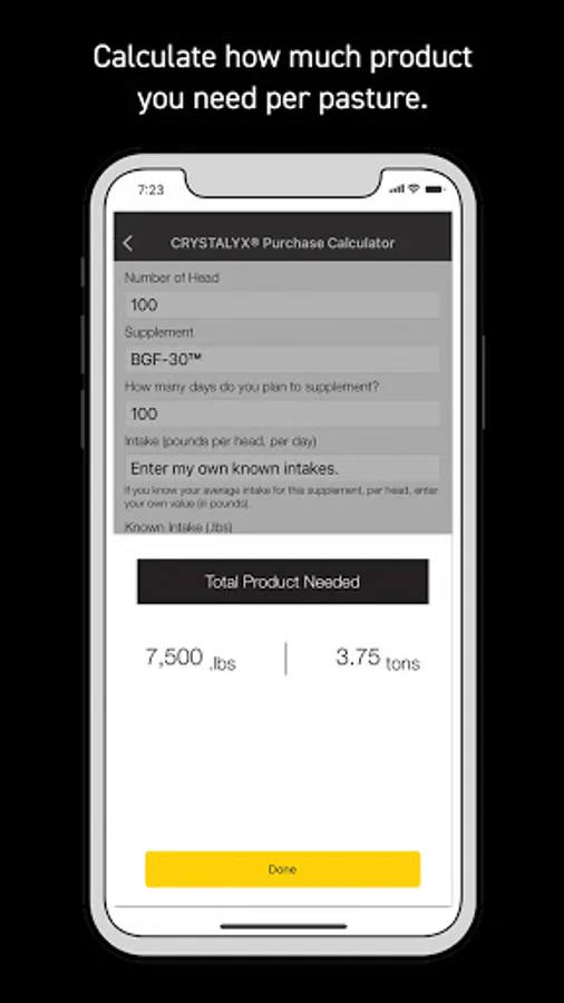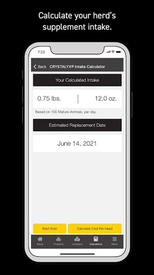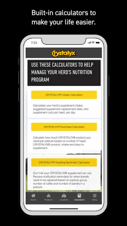 Utilize the many more features of the app for your convenience! Use the built-in calculators to help manage your herd's nutrition program. Choose from the CRYSTALYX Intake Calculator, Purchase Calculator and the Feeding Reminder Calculator — we're here to make your life easier!