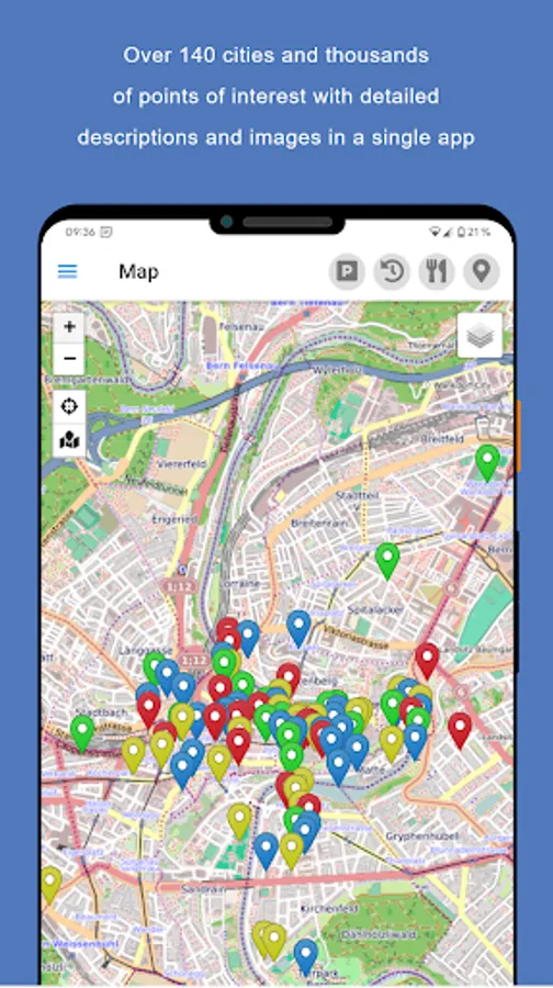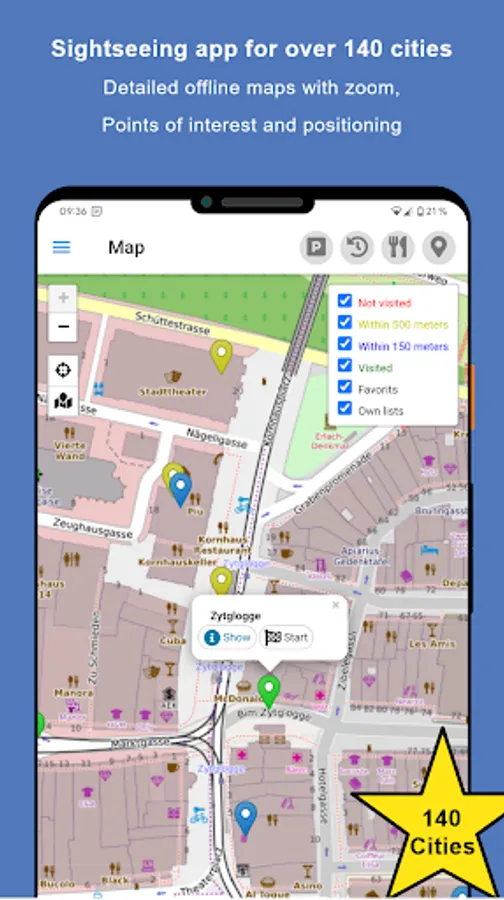 Functional cutout: Reading aloud of sights, offline maps, list view, search function, history view, city change, favorites, data protection!