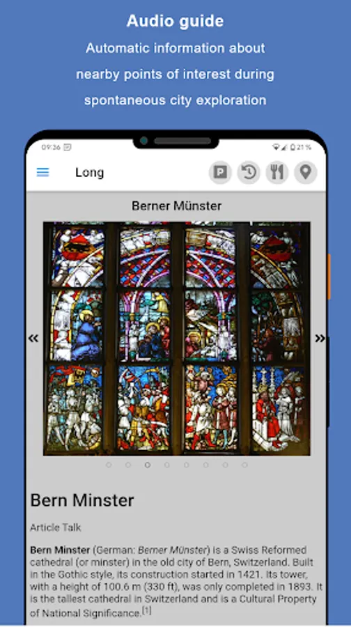Just use any mode of transport and explore the city freely and casually. If you come close to a place of interest, the app draws your attention to it with a precise direction and distance indication as well as a meaningful picture. A short description of the sight is both read aloud and displayed, just like on a sightseeing bus tour.