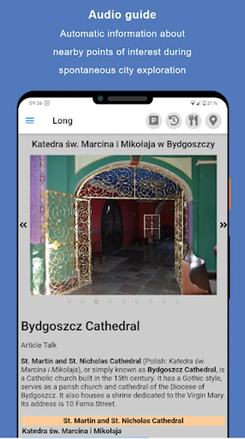 Just use any mode of transport and explore the city freely and casually. If you come close to a place of interest, the app draws your attention to it with a precise direction and distance indication as well as a meaningful picture. A short description of the sight is both read aloud and displayed, just like on a sightseeing bus tour.