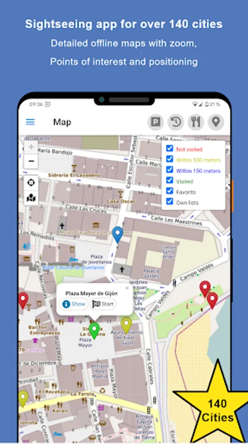 Functional cutout: Reading aloud of sights, offline maps, list view, search function, history view, city change, favorites, data protection!