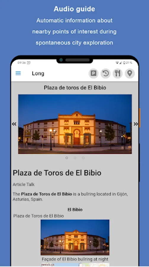 Just use any mode of transport and explore the city freely and casually. If you come close to a place of interest, the app draws your attention to it with a precise direction and distance indication as well as a meaningful picture. A short description of the sight is both read aloud and displayed, just like on a sightseeing bus tour.