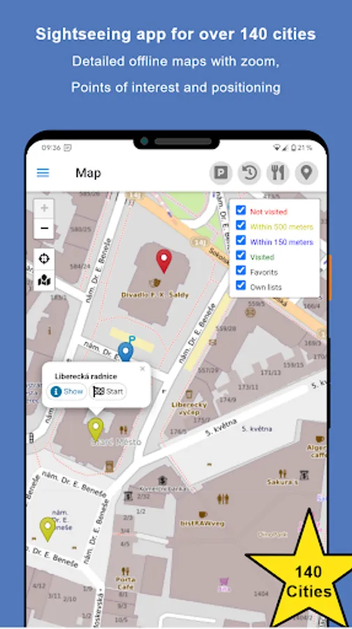 Functional cutout: Reading aloud of sights, offline maps, list view, search function, history view, city change, favorites, data protection!
