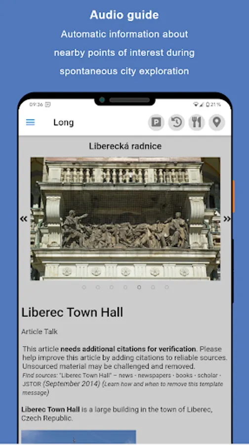 Just use any mode of transport and explore the city freely and casually. If you come close to a place of interest, the app draws your attention to it with a precise direction and distance indication as well as a meaningful picture. A short description of the sight is both read aloud and displayed, just like on a sightseeing bus tour.