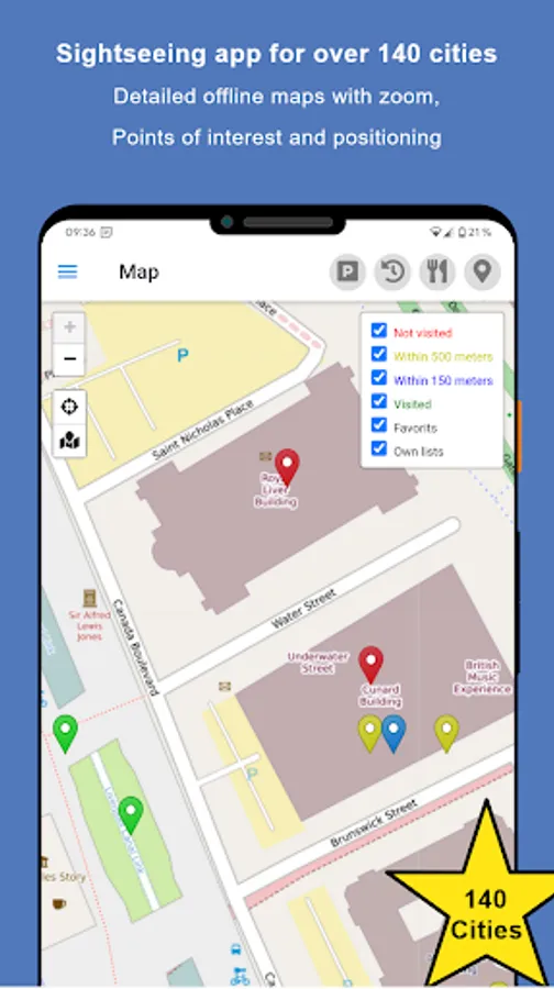 Functional cutout: Reading aloud of sights, offline maps, list view, search function, history view, city change, favorites, data protection!