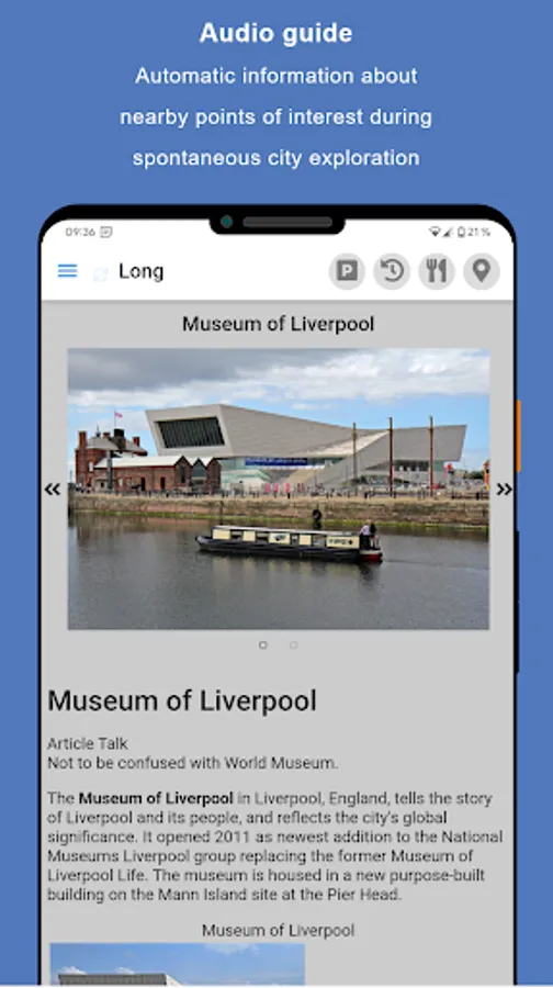 Just use any mode of transport and explore the city freely and casually. If you come close to a place of interest, the app draws your attention to it with a precise direction and distance indication as well as a meaningful picture. A short description of the sight is both read aloud and displayed, just like on a sightseeing bus tour.