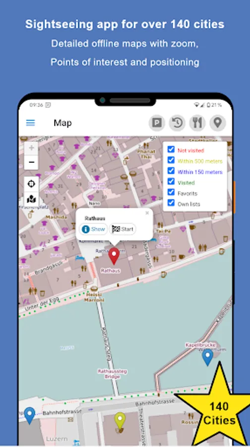 Functional cutout: Reading aloud of sights, offline maps, list view, search function, history view, city change, favorites, data protection!