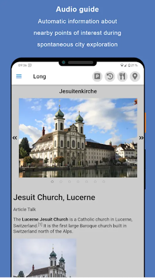 Just use any mode of transport and explore the city freely and casually. If you come close to a place of interest, the app draws your attention to it with a precise direction and distance indication as well as a meaningful picture. A short description of the sight is both read aloud and displayed, just like on a sightseeing bus tour.