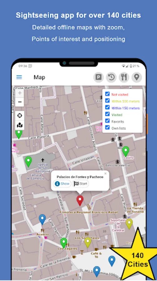 Functional cutout: Reading aloud of sights, offline maps, list view, search function, history view, city change, favorites, data protection!