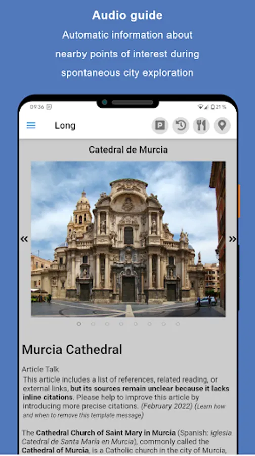 Just use any mode of transport and explore the city freely and casually. If you come close to a place of interest, the app draws your attention to it with a precise direction and distance indication as well as a meaningful picture. A short description of the sight is both read aloud and displayed, just like on a sightseeing bus tour.