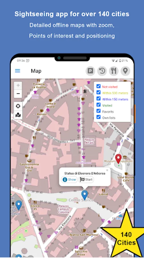 Functional cutout: Reading aloud of sights, offline maps, list view, search function, history view, city change, favorites, data protection!