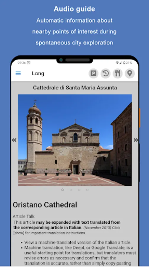 Just use any mode of transport and explore the city freely and casually. If you come close to a place of interest, the app draws your attention to it with a precise direction and distance indication as well as a meaningful picture. A short description of the sight is both read aloud and displayed, just like on a sightseeing bus tour.