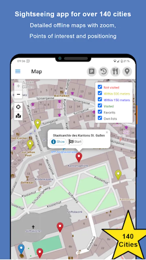 Functional cutout: Reading aloud of sights, offline maps, list view, search function, history view, city change, favorites, data protection!