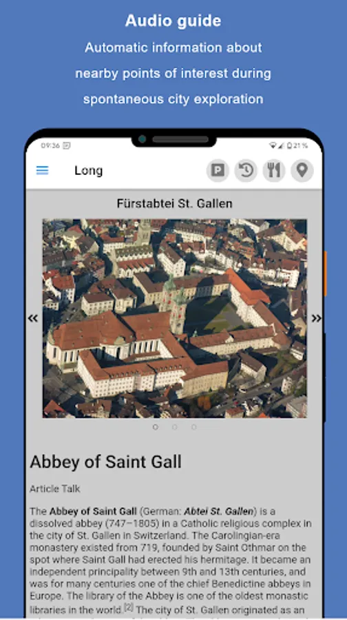 Just use any mode of transport and explore the city freely and casually. If you come close to a place of interest, the app draws your attention to it with a precise direction and distance indication as well as a meaningful picture. A short description of the sight is both read aloud and displayed, just like on a sightseeing bus tour.