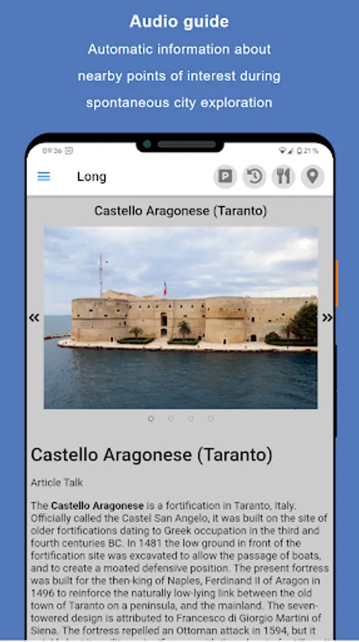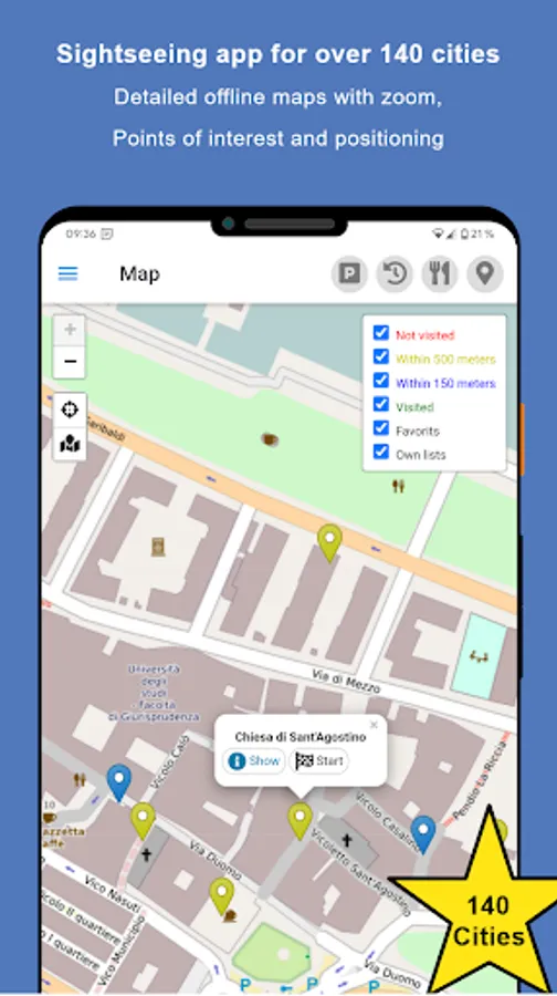 If the current sight has aroused your interest, you can call up a multitude of additional pictures and information with just one swipe. By displaying all sights and your current position on the integrated offline map you will never lose your orientation.