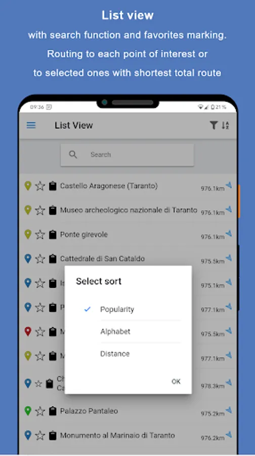 * List view of all sights with search function
