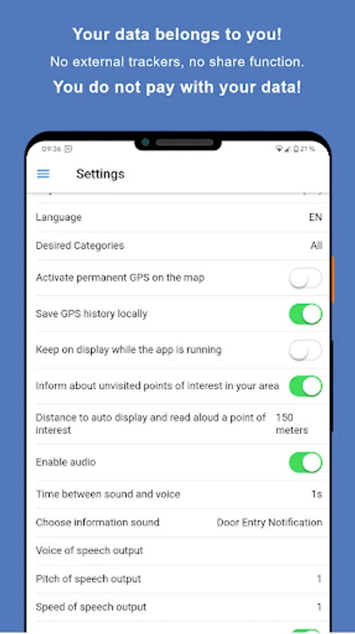 Functional cutout: Reading aloud of sights, offline maps, list view, search function, history view, city change, favorites, data protection!