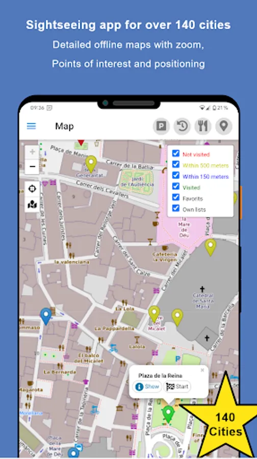 Functional cutout: Reading aloud of sights, offline maps, list view, search function, history view, city change, favorites, data protection!