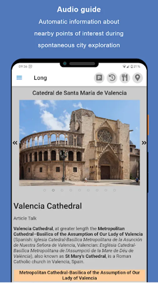 Just use any mode of transport and explore the city freely and casually. If you come close to a place of interest, the app draws your attention to it with a precise direction and distance indication as well as a meaningful picture. A short description of the sight is both read aloud and displayed, just like on a sightseeing bus tour.