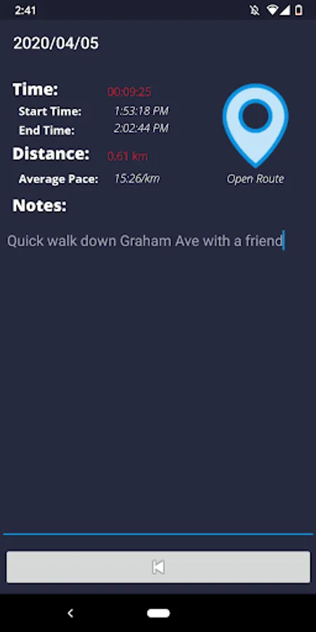 - The app will display your run time, distance, average pace, notes, and a button to view your route.