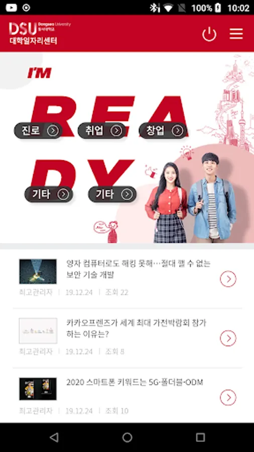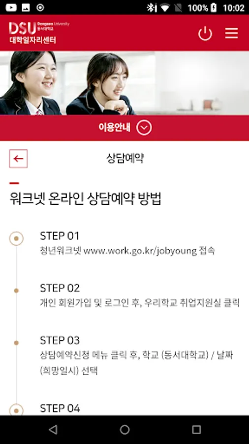 This application contains descriptions of various career / employment and entrepreneurship education programs operated by Dongseo University College Job Center for Dongseo University students / local youth, application, portfolio and other youth employment policies.
