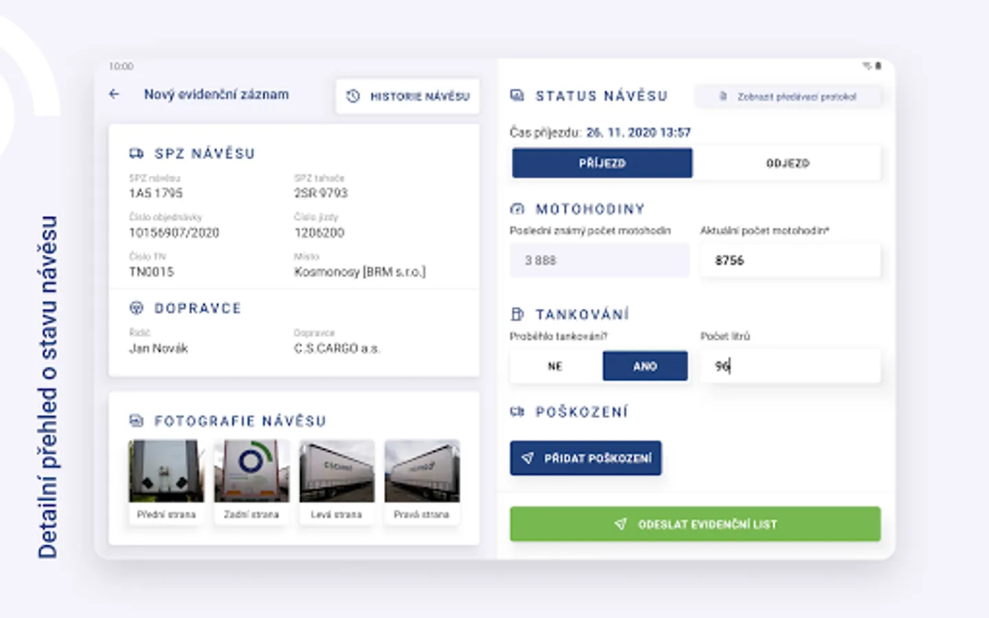 The application allows you to create a vehicle registration sheet at the entrance gate of the warehouse. Vehicle information and data are provided by C.S.CARGO and only authorized users of this company have access to the CSC GATE application. Through the application it is possible to quickly check the current state of the vehicle. The registration form of the selected vehicle also contains a simple damage report or a preview of the historical registration records.
