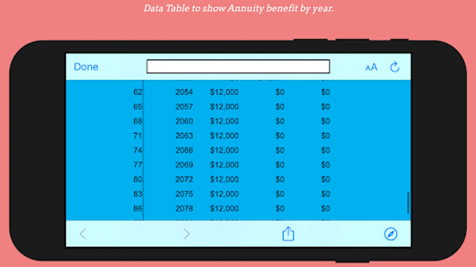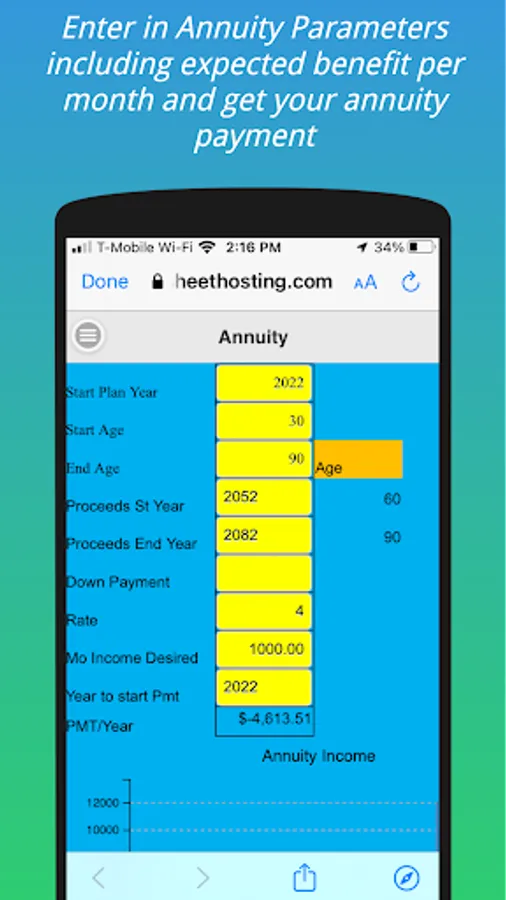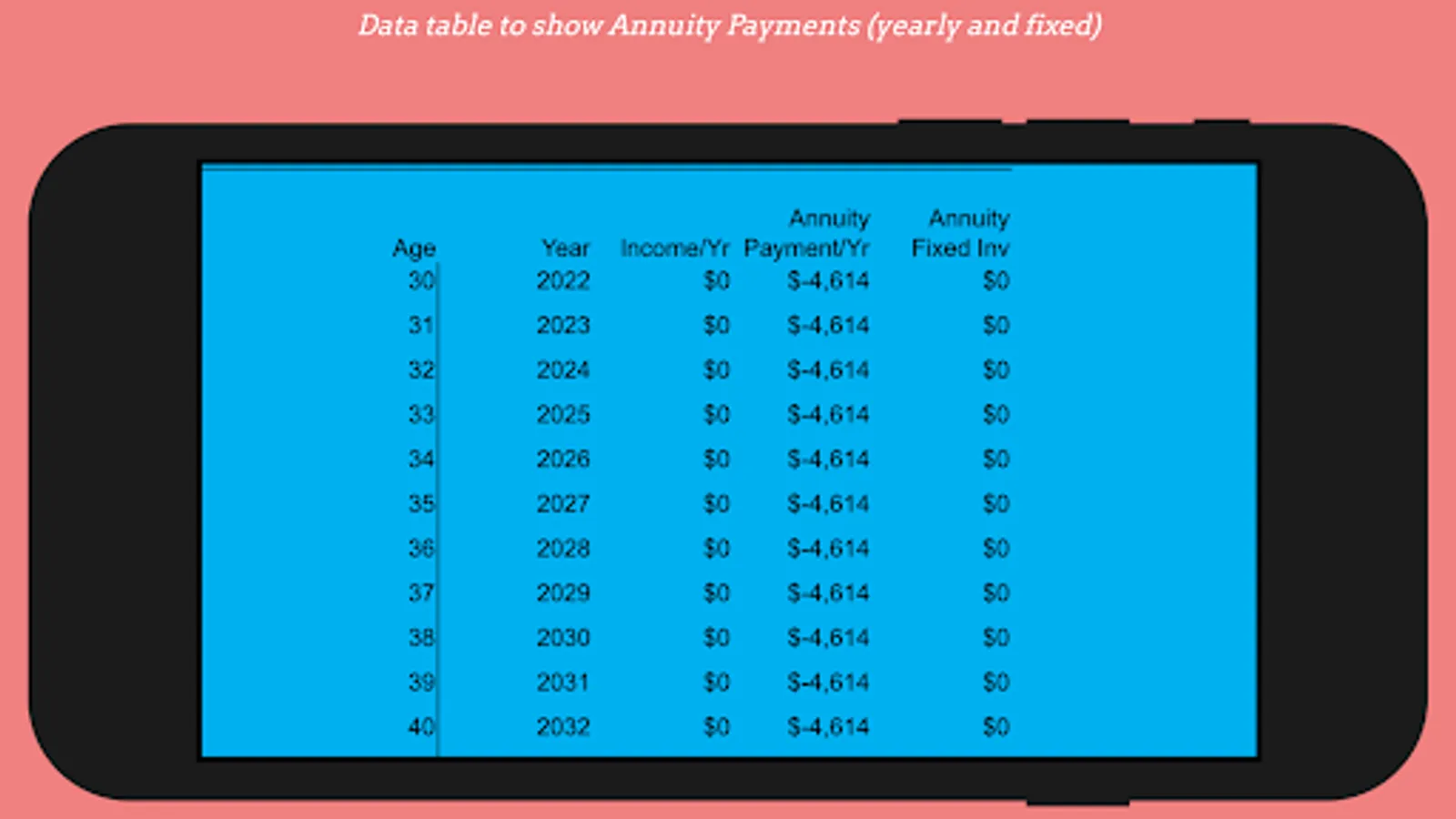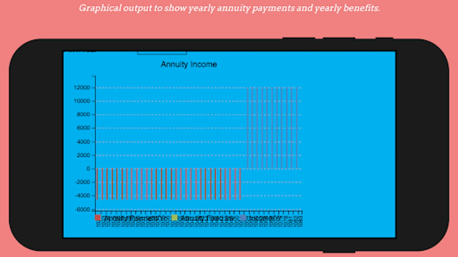 Calculates the cost of an annuity based upon the monthly payment you desire and how long you will be paying on it. Gives you a nice graph to illustrate your payments as well as the benefit payments you will receive. The application also gives you a data table that calculates your payments and benefits year to year over your lifetime.