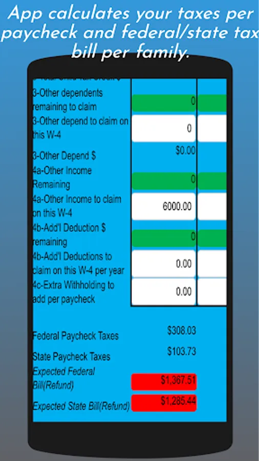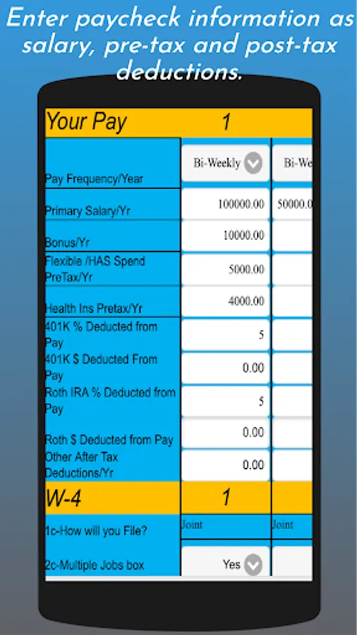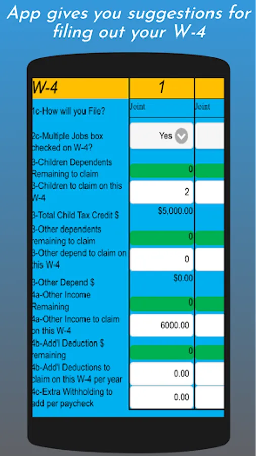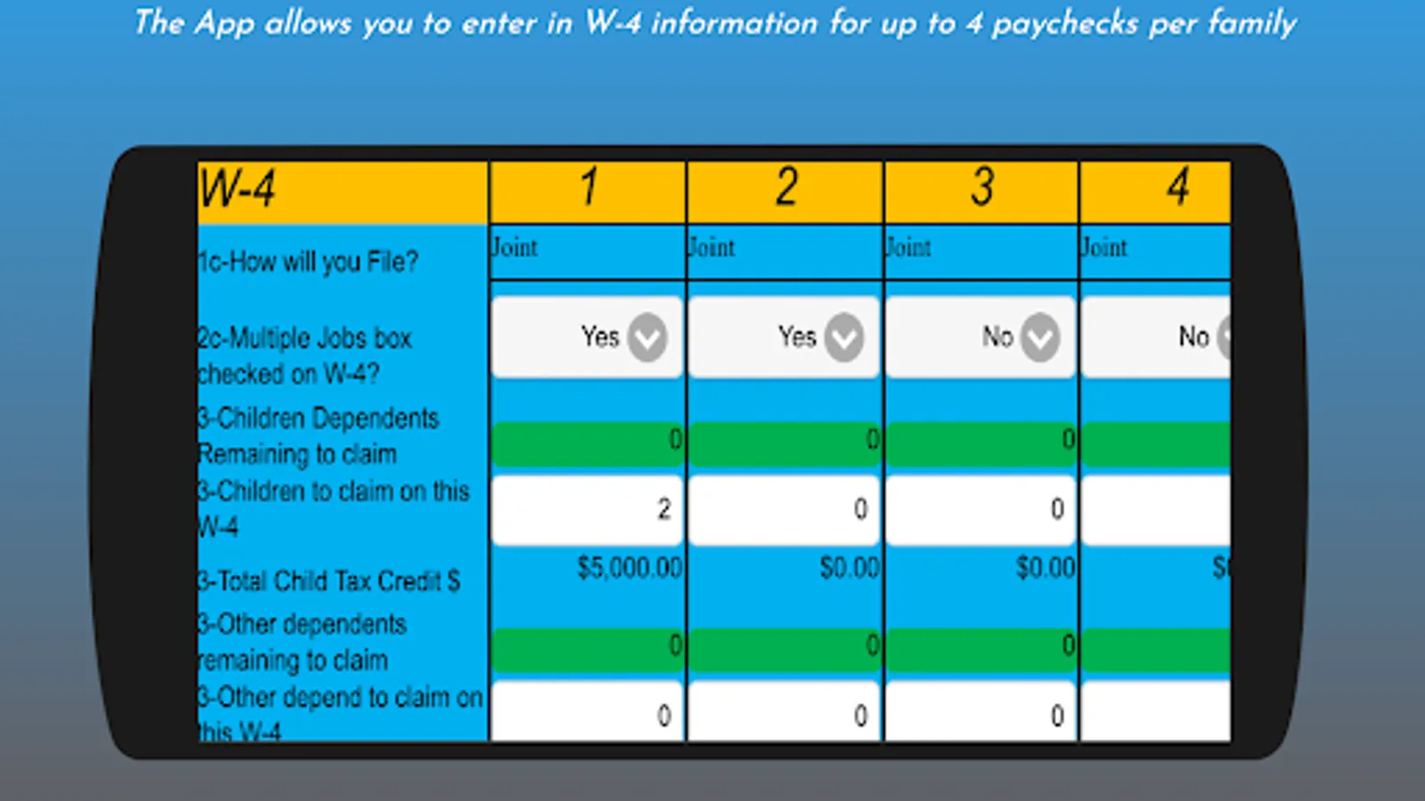 Easy W-4 enables you to correctly enter information on your W-4 so taxes are withheld correctly so you do not owe or get a significant refund when you file tax returns. When you have multiple paychecks in the family, taxes typically are under withheld and you will owe when you file your tax return. Checking box for multiple paychecks on your W-4 helps but is a poor estimation. Easy W-4 accounts for multiple paychecks as well as estimates what you should be putting on your W-4 for additional income and deductions. This tool will keep you from any surprises when you file your tax returns.