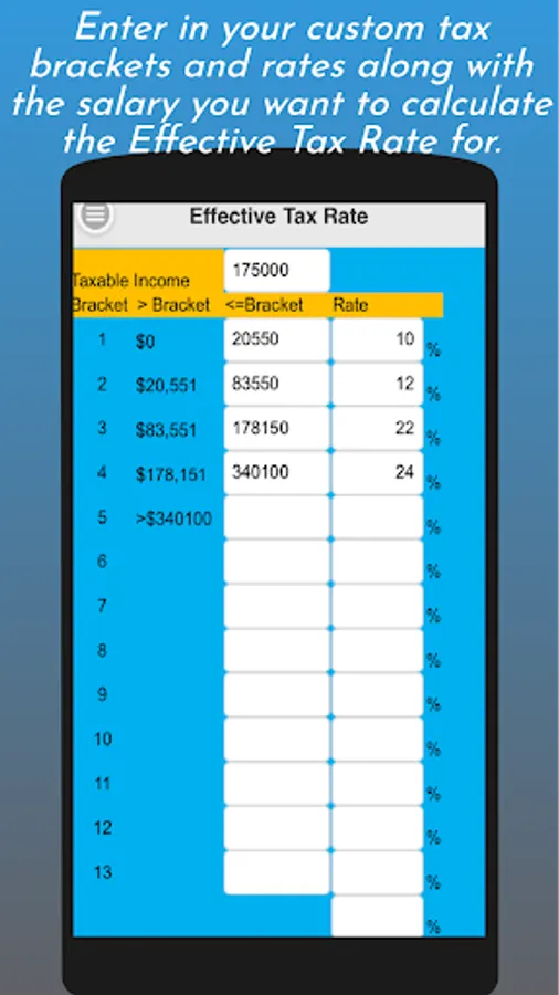 The effective tax rate is your total tax as a percent of your taxable income. The Effective Tax Rate Calculator calculates your effective tax rate from federal, state or any country based upon the tax brackets and income you enter. The effective tax rate is an effective way to discuss what percent you actually pay in taxes.
