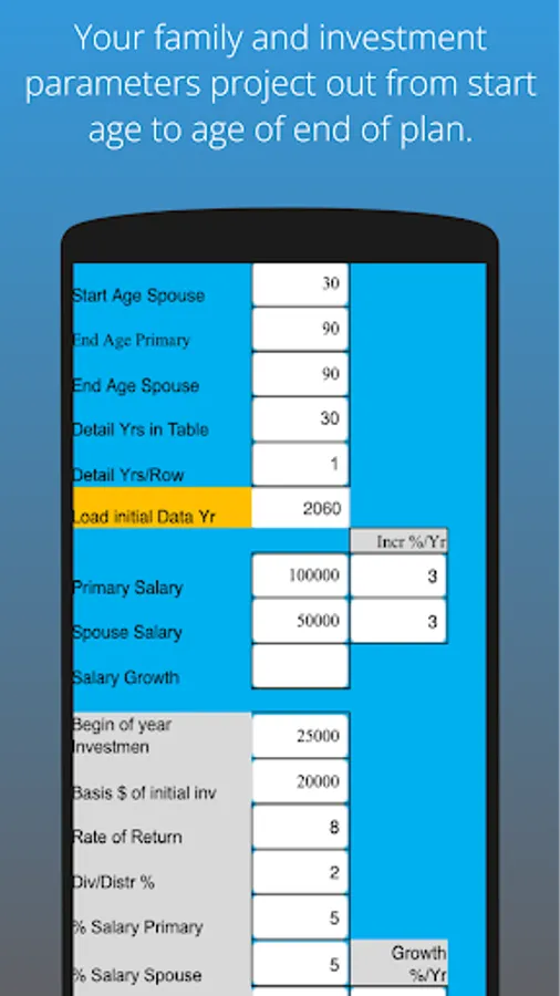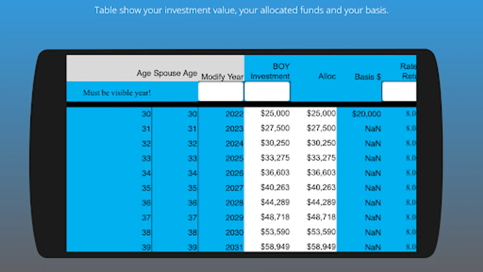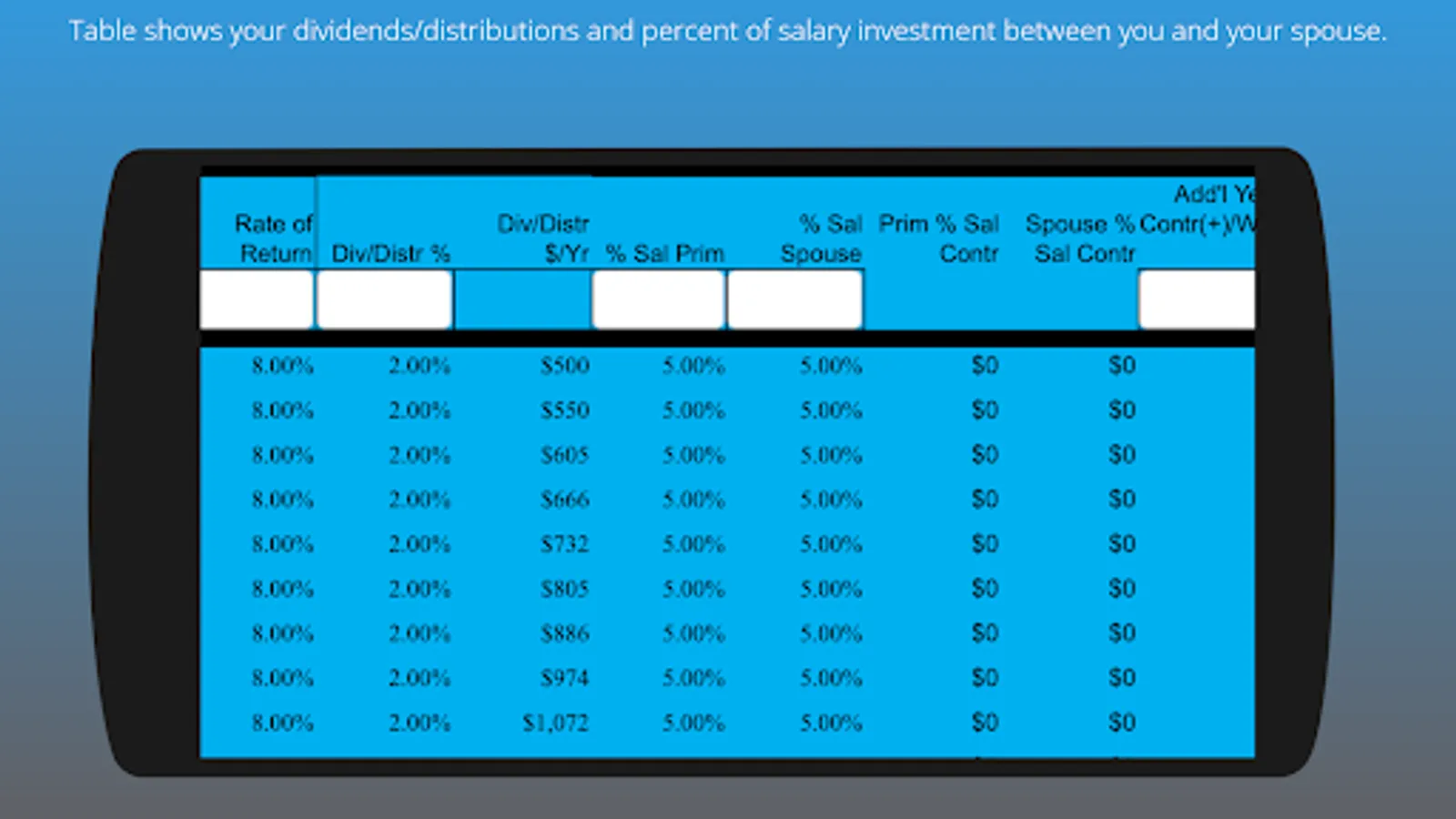 Calculates your individual stock or mutual fund balance. Shows you the growth of this fund over your life span. Allows you to specify the contribution as a dollar figure or a percent of you and your spouse’s salary. Allows you to modify the plan years out.