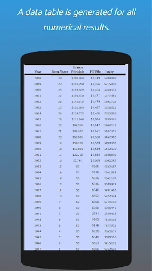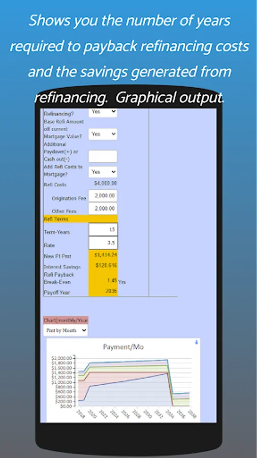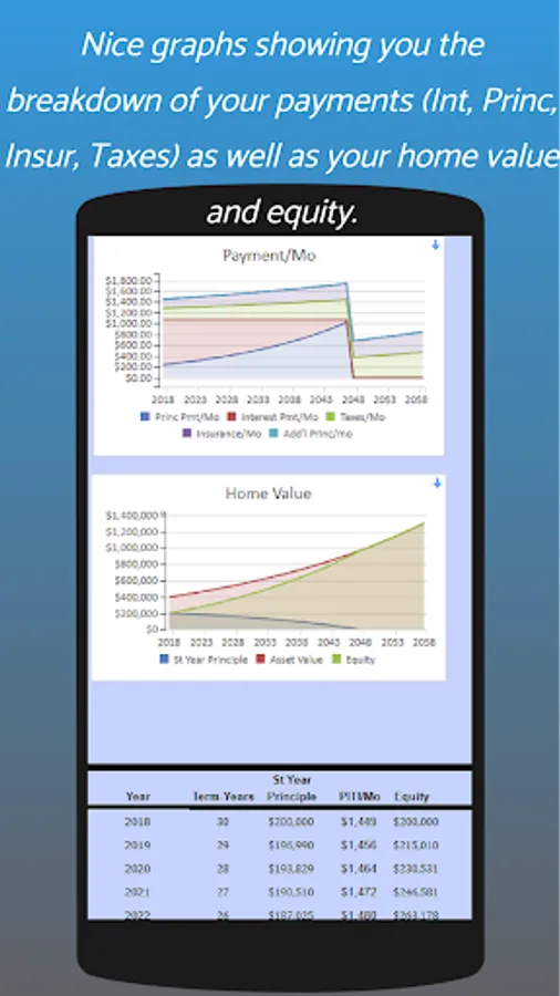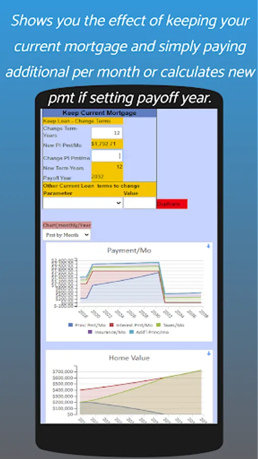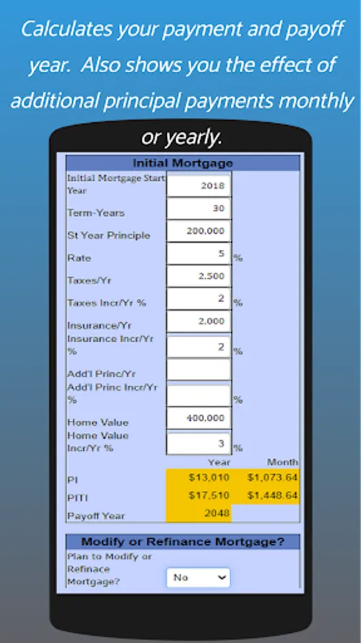 It is a difficult decision of whether to keep your current mortgage and pay off early or pay to refinance your mortgage. Mortgage Payoff Analyzer will not only calculate the payment (PITI) of a current or new mortgage but also specifies what the break even years would be to refinance. It also calculates what the payment would be to pay off your current mortgage in a set number of years or what the reduction of loan years would be to increase your payment. The tool also tracks your home equity. Amortization graphs and tables provided.
