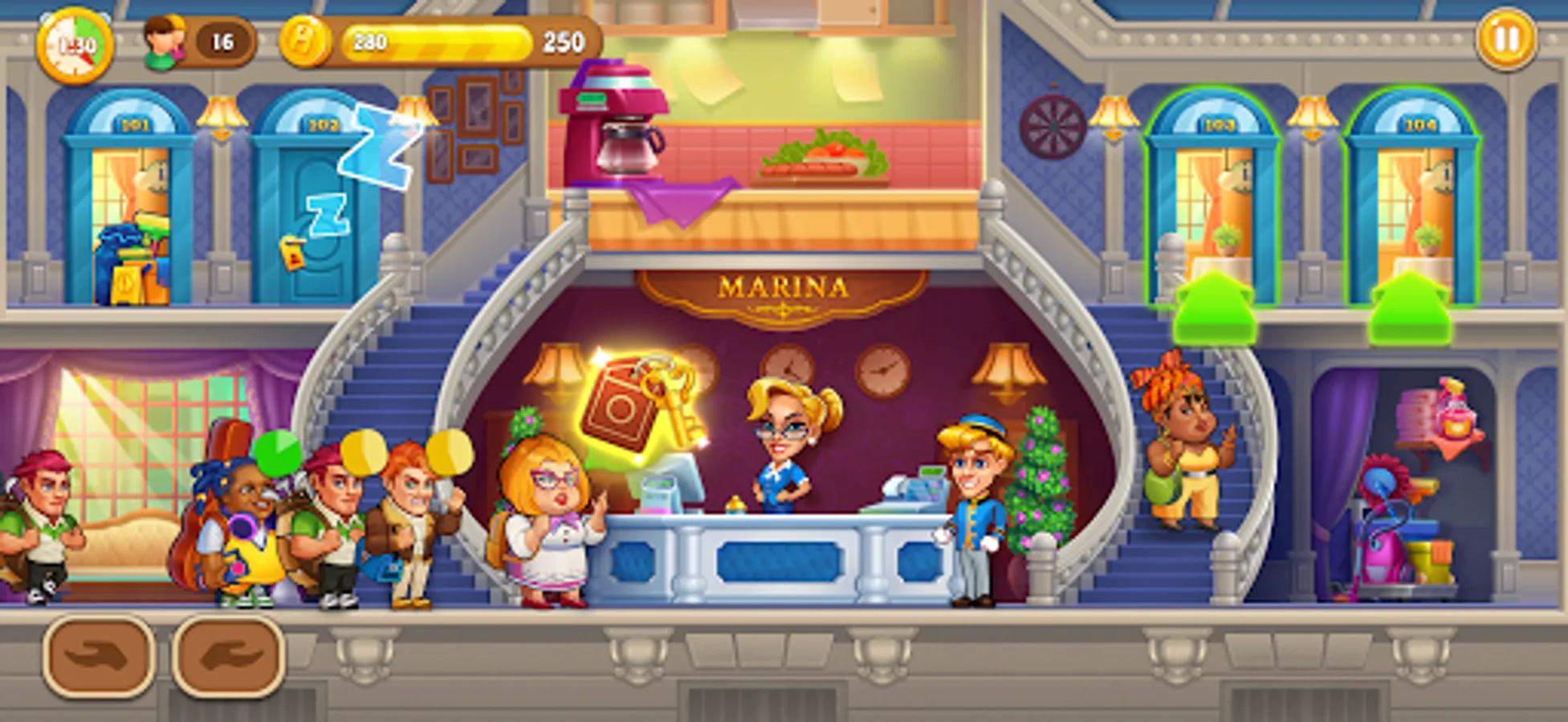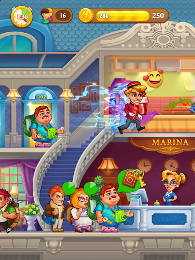 With hotel games for free, time-management is so important! During rush times, the number of guests coming to your hotel is too crowded, do not forget the boosters. They can help you boost serving speed and finish hard challenges, grand hotel mania, craze hotel, doorman story