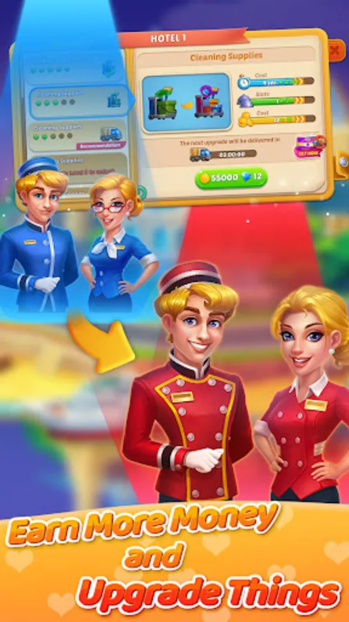 Get yourself ready and build your own hotel empire, manage your staffs and fulfil customers' requests to become the world’s greatest luxury hotel 💎. Complete daily quests and get rewards to unlock new fascinating adventures and places.