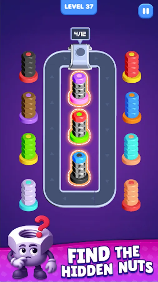 • Hidden Nuts: Some stacks hide their colors behind mystery layers — reveal them at the right time!