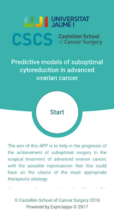 The aim of this APP is to help in the prognosis of the achievement of suboptimal surgery in the surgical treatment of advanced ovarian cancer, with the possible repercussion that this could have on the choice of the most appropriate therapeutic strategy.
