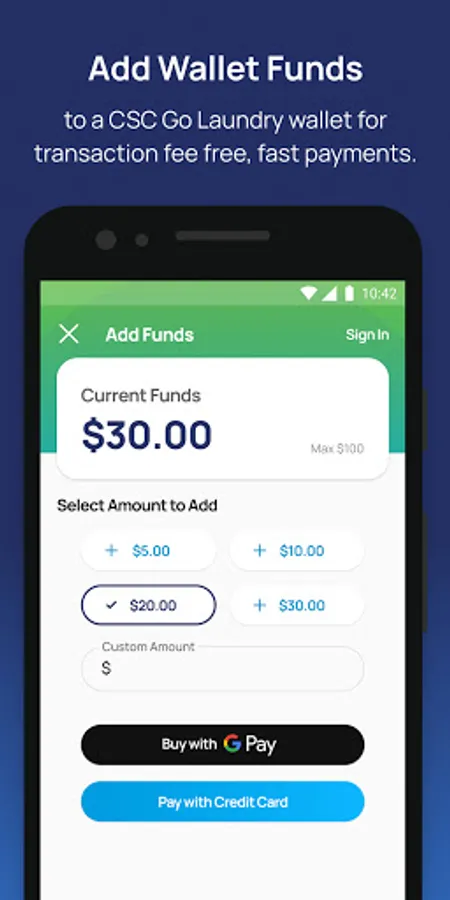 • Add funds to a CSC Go Laundry wallet for faster, no transaction-fee wash or dry payment