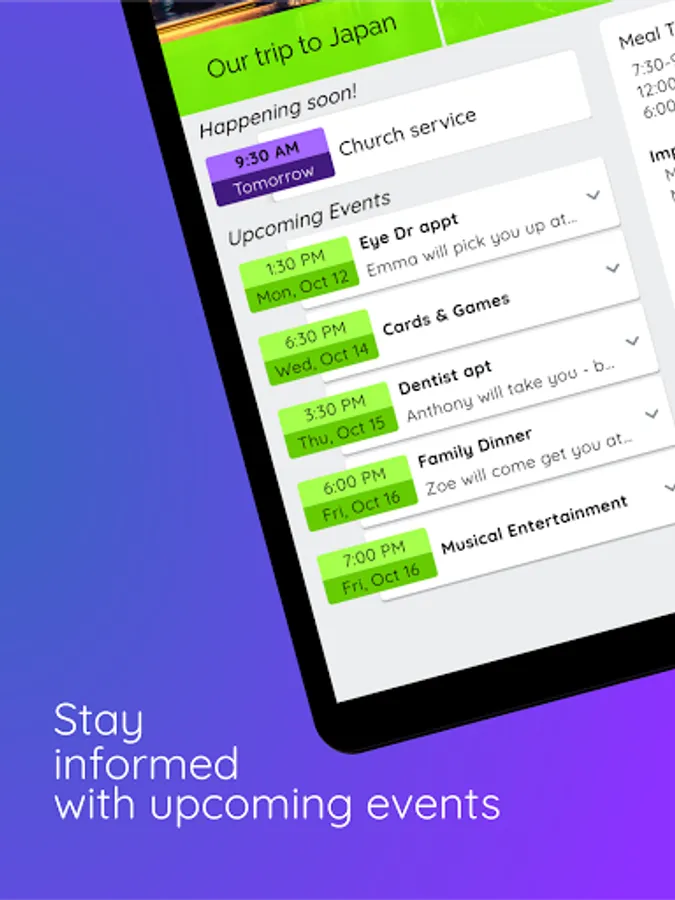* manage your loved one's upcoming events in a shared online calendar so they always have their schedule visible