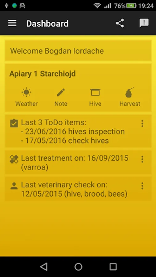 • Check your Timeline - contains all beehive reports, to do actions, colonies movements, harvests, treatments and veterinary checks ordered descending by date.