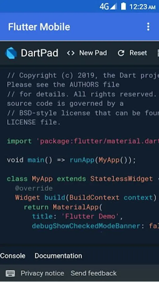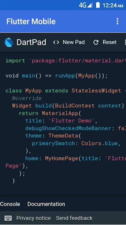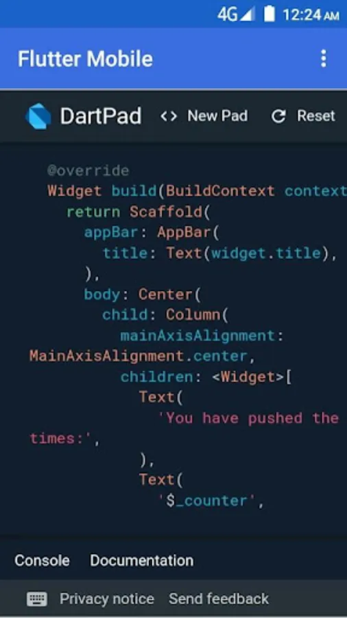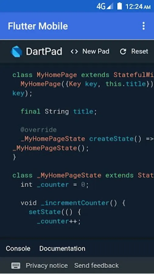 Mobile Flutter ( DartPad ) is application based on WebView to implement all features of https://dartpad.dartlang.org