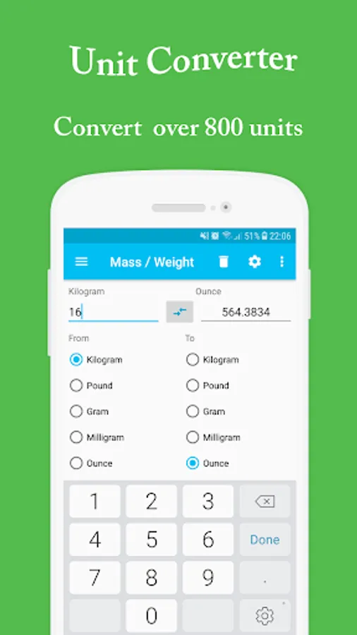 ✓ Mass (Weight): (pound ,ounce ,stone ,ton [Long UK] ,ton [Short US] ,ton [metric] ,kilogram ,gram ,milligram ,grains)