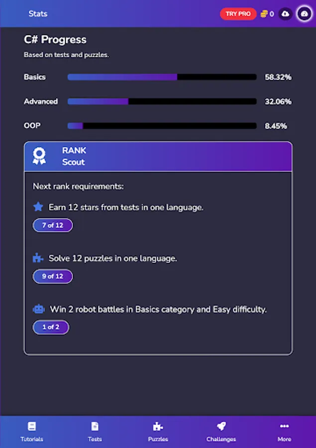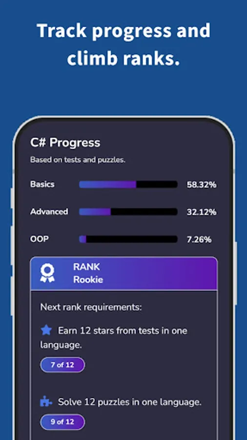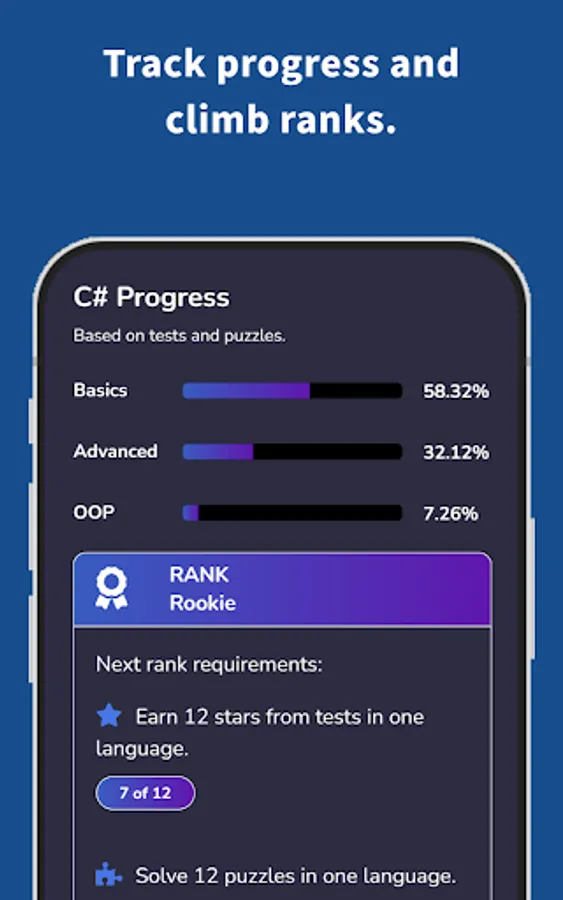 Make your C# learning experience awesome by climbing ranks (like in a game) for completing tasks. This way you can climb up to the top and become C# programmer. It doesn't matter if you are a novice who starts his/her C# coding journey or you're more advanced and learning OOP - Object oriented programming in C#.