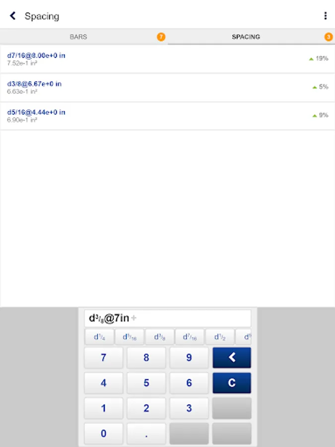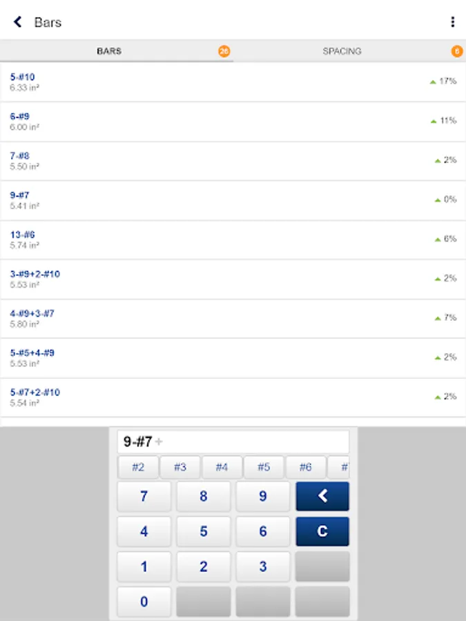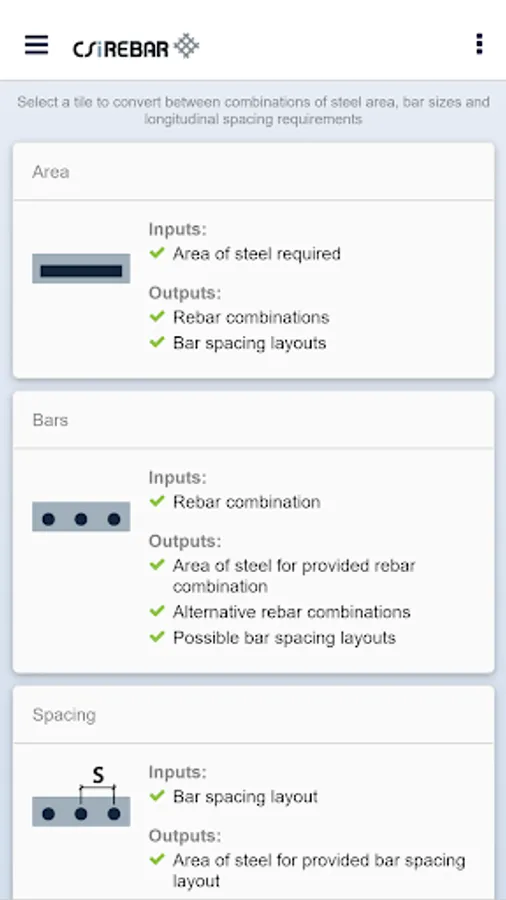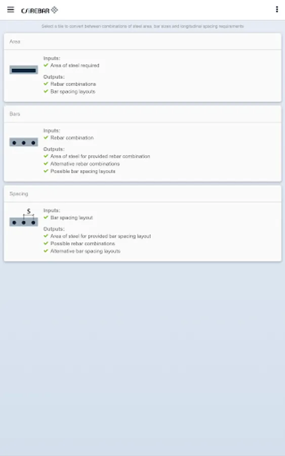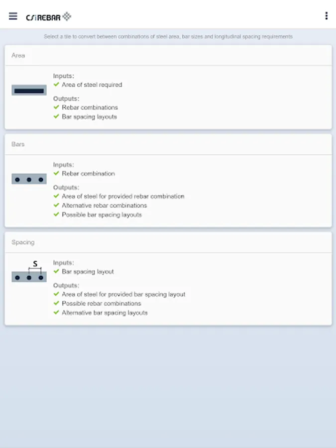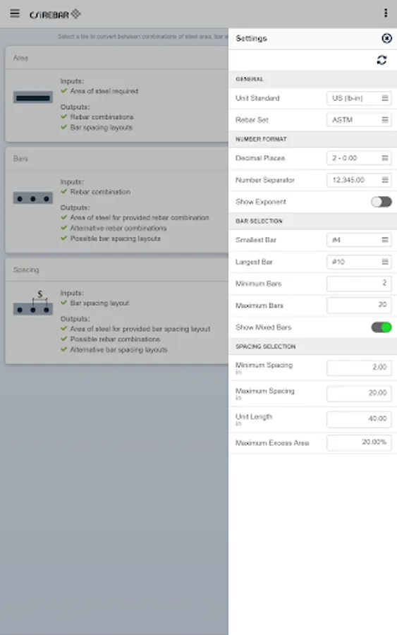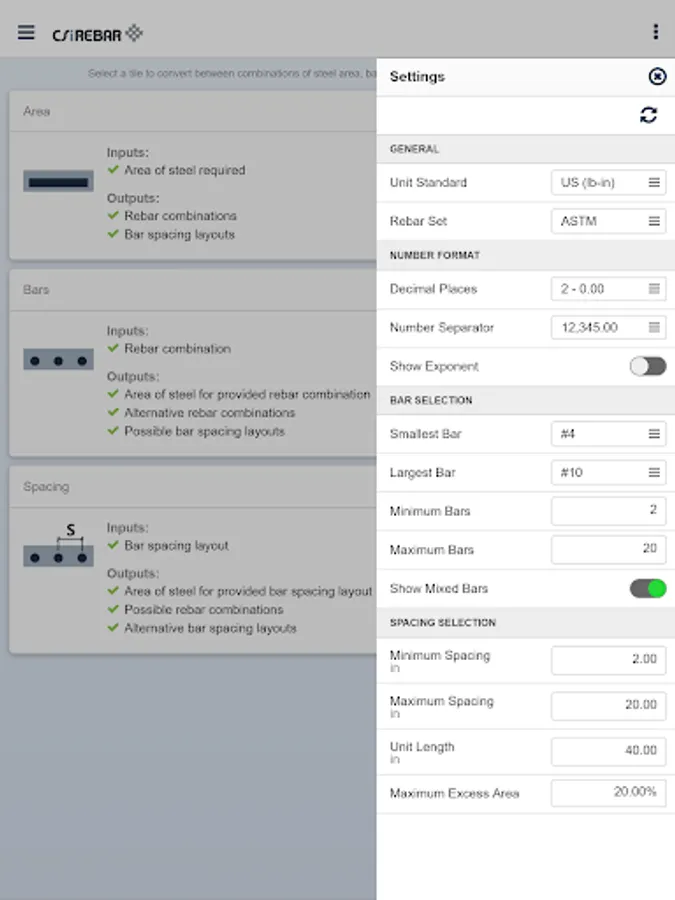 CSiRebar is an app that conveniently converts between combinations of bar sizes, steel area, and spacing requirements.