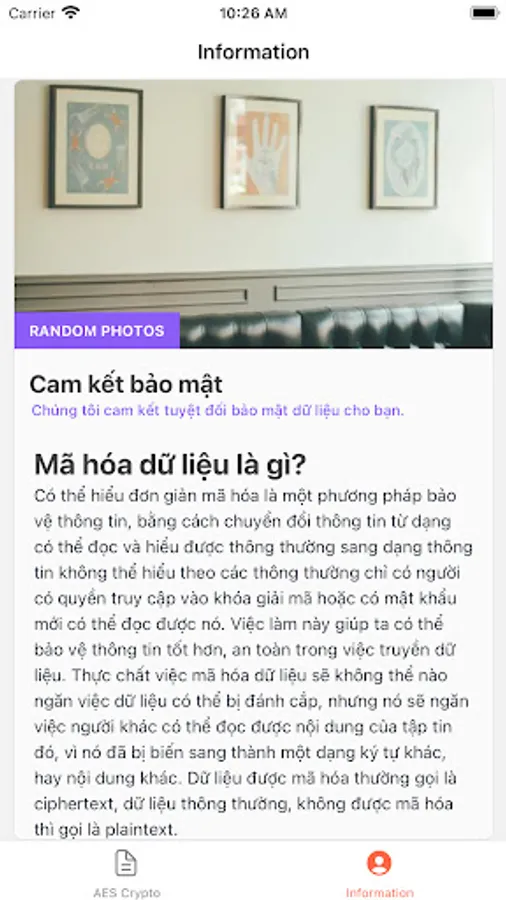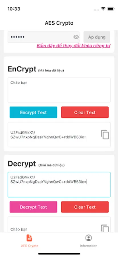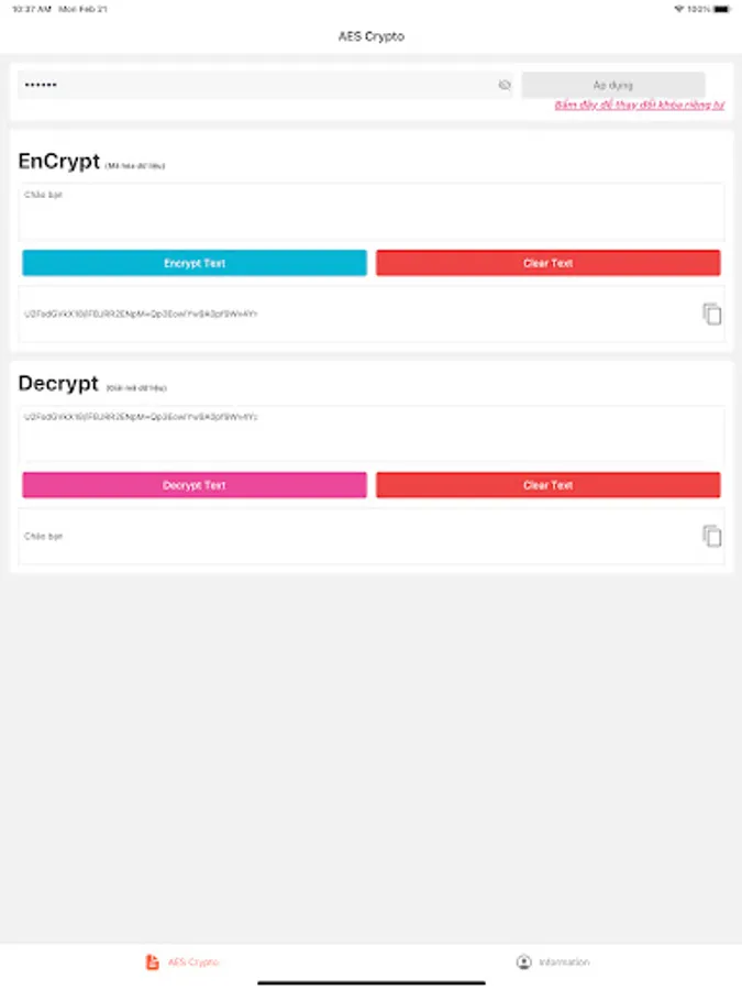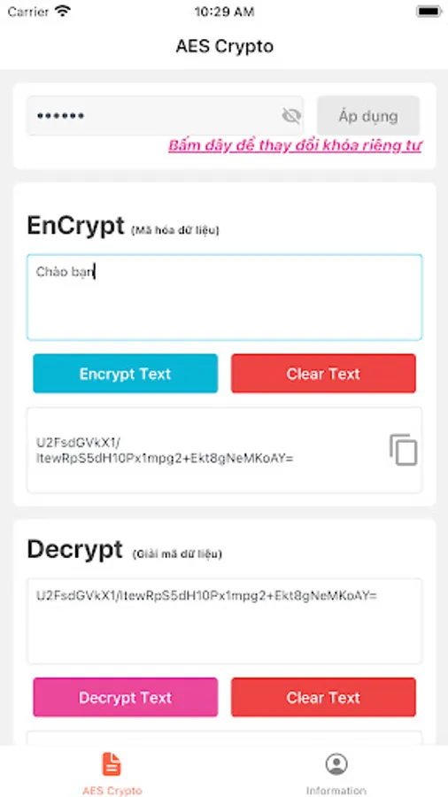 The application allows you to encrypt a piece of text using the Public Key AES encryption method.