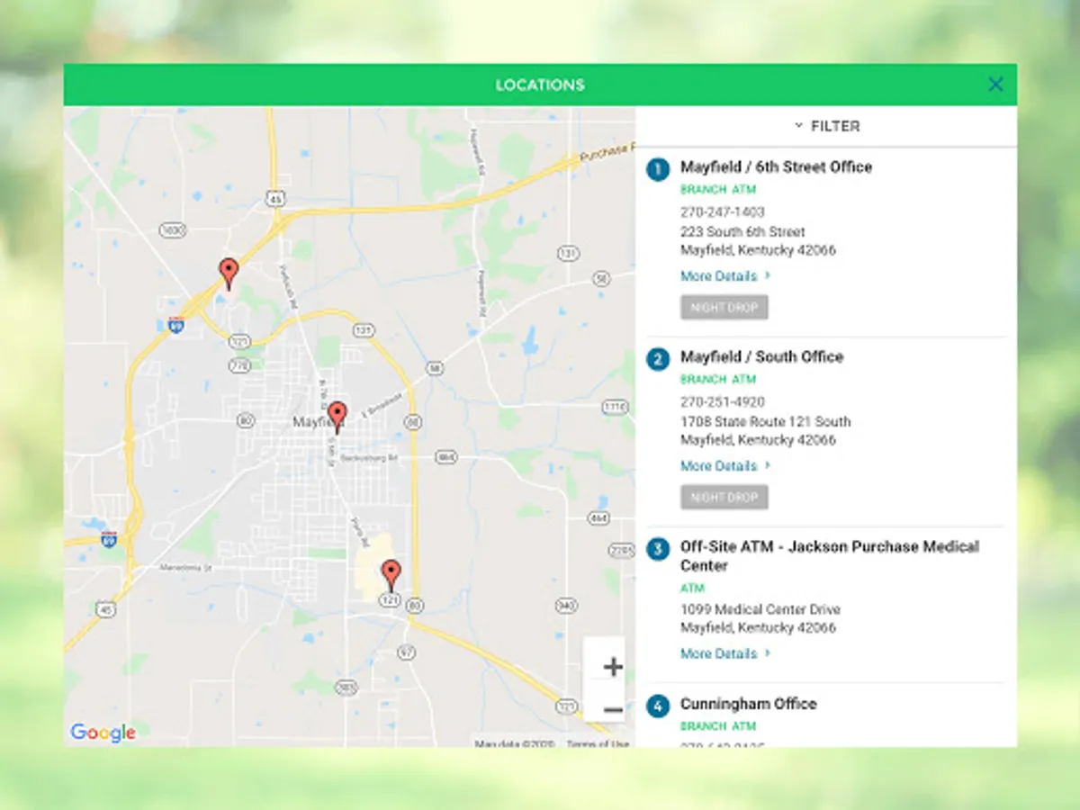 - Find nearby branches and ATMs. You can search by zip code or address.