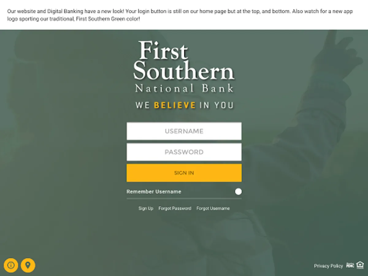 Logging in is quick and easy for existing First Southern National Bank Online Banking customers. To login to the First Southern National Bank Mobile App, use your current Online Banking credentials.