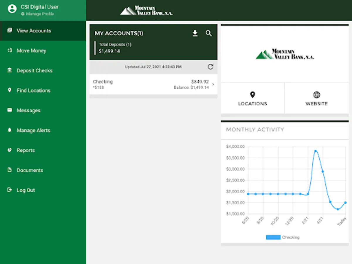 Mountain Valley Bank Mobile Banking allows you to bank on the go, offering quick access for managing your bank accounts! Check your balances, view activity, pay bills, transfer money, and find our ATMs and bank locations with just a touch. Our native app is fast, secure and free. Use your current online banking login credentials to begin using the app today.