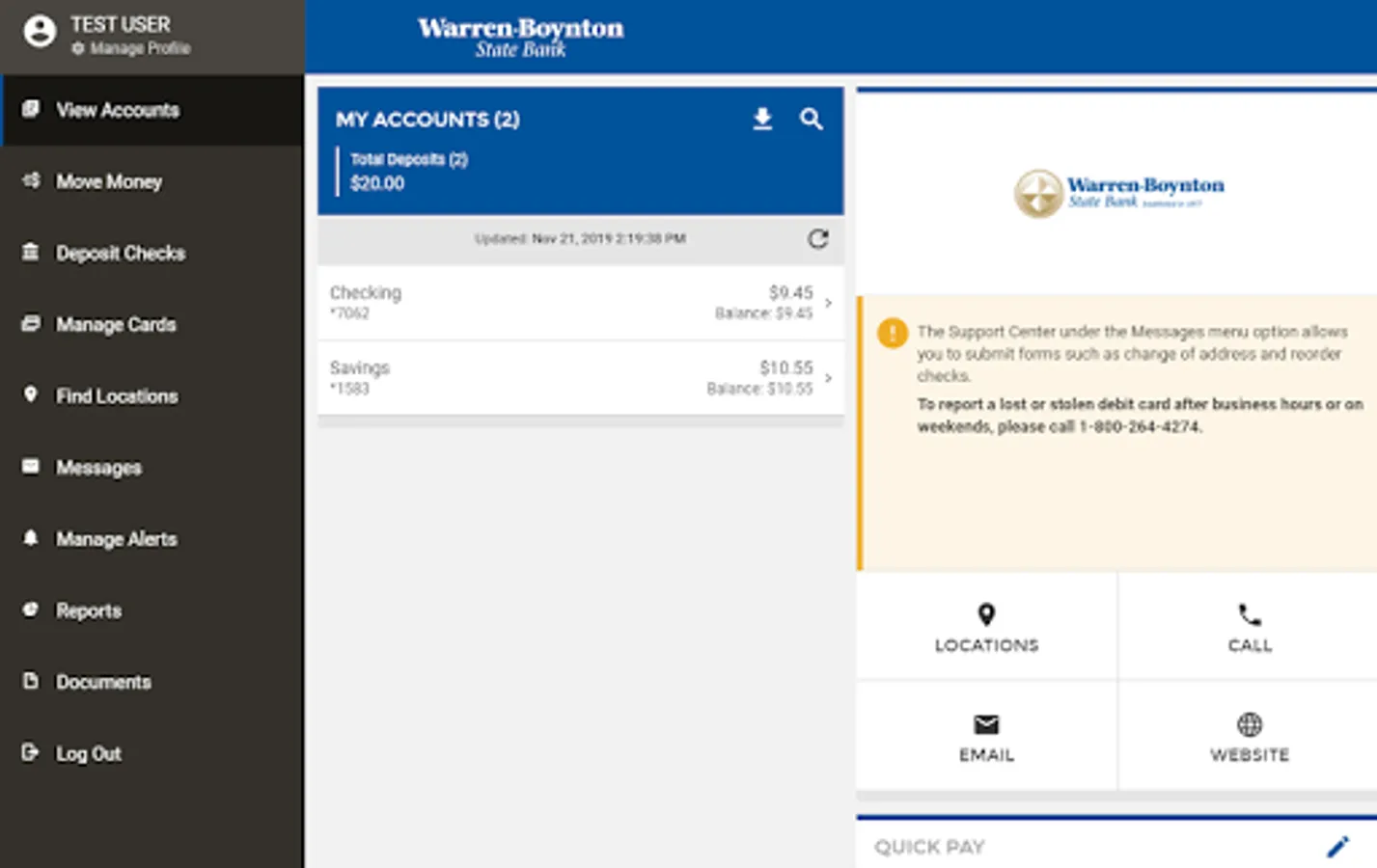 You can contact us at 1-217-488-6091 if you have any questions about the Warren-Boynton State Bank Mobile App or the self-service registration process.