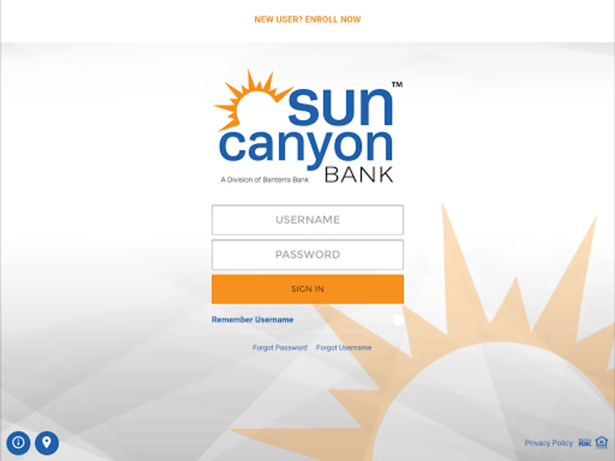 You can get started instantly with Sun Canyon Bank App by enrolling directly on the app. Simply download the app and click on “New User? Enroll Now” button at the top of the app screen. After enrollment, you will have access to Sun Canyon Digital Banking, both on your mobile app and when visiting our website.