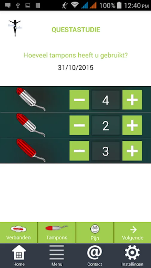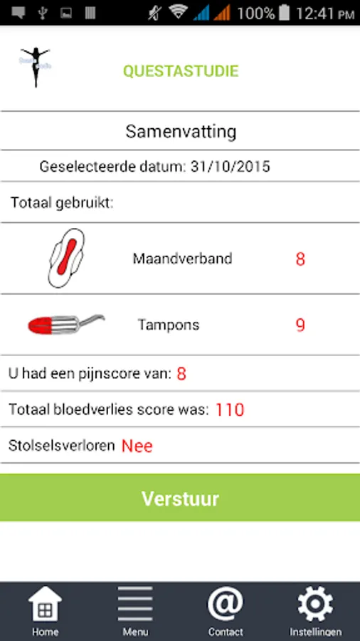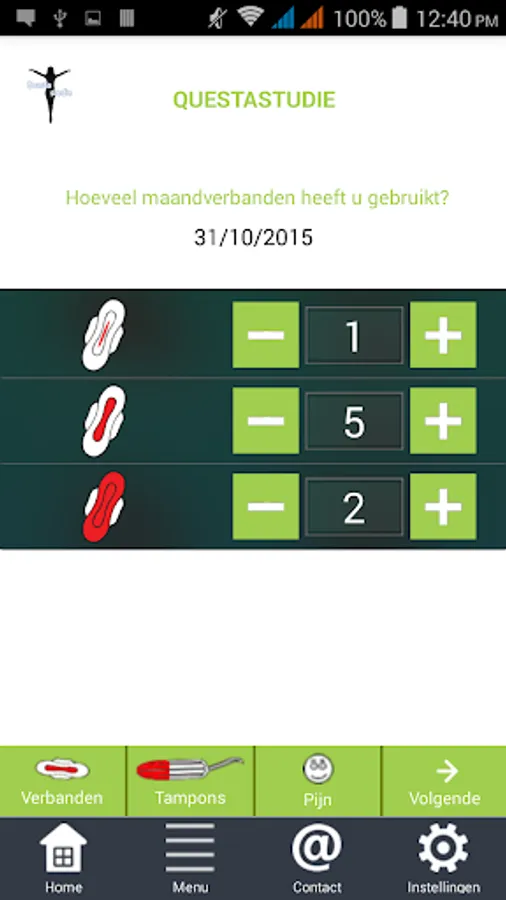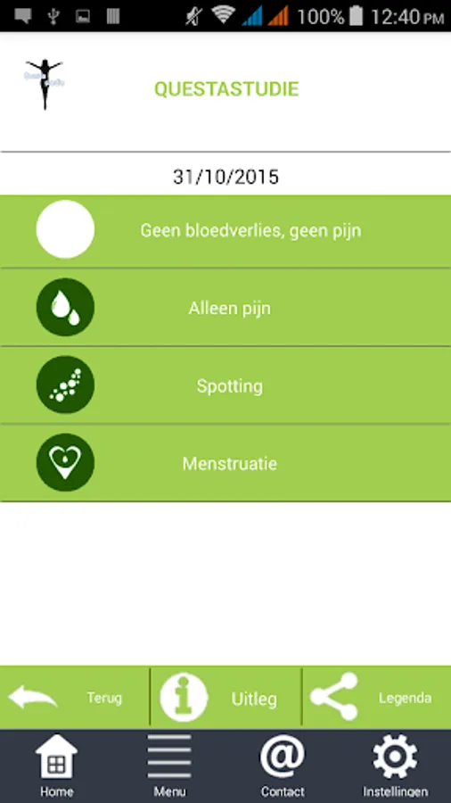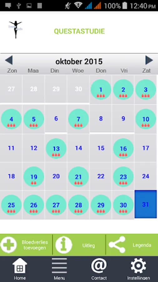 This app is designed to allow women to keep their menstrual cycle. Only when you enter the QUESTA the research you can use this app. There will also be a general app than what you can find under the name "menstrual bleeding calendar" for women who do not participate in our research.