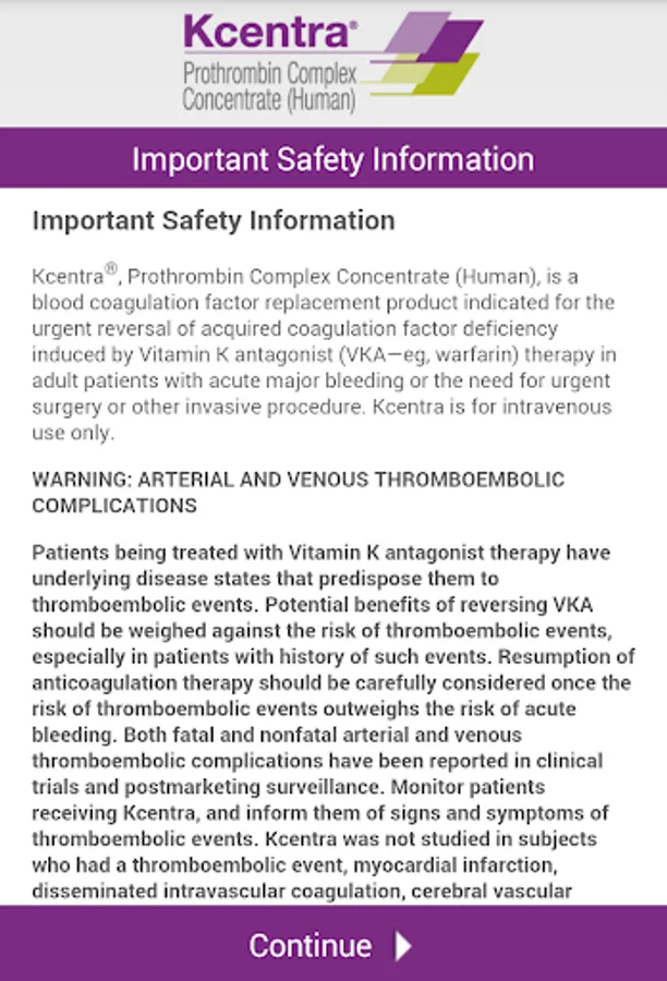 Kcentra®, Prothrombin Complex Concentrate (Human), is a blood coagulation factor replacement product indicated for the urgent reversal of acquired coagulation factor deficiency induced by Vitamin K antagonist (VKA—eg, warfarin) therapy in adult patients with acute major bleeding or the need for urgent surgery or other invasive procedure. Kcentra is for intravenous use only.